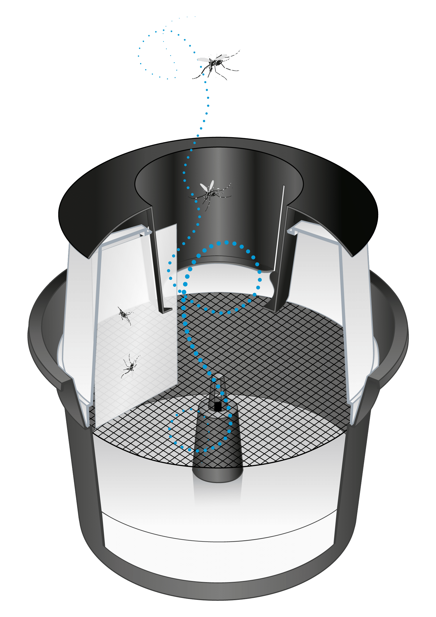 Le piège simule un site de ponte, toutefois les larves ne pourront pas s’y développer au sein du piège grâce à l’ingénieux filet de capture.