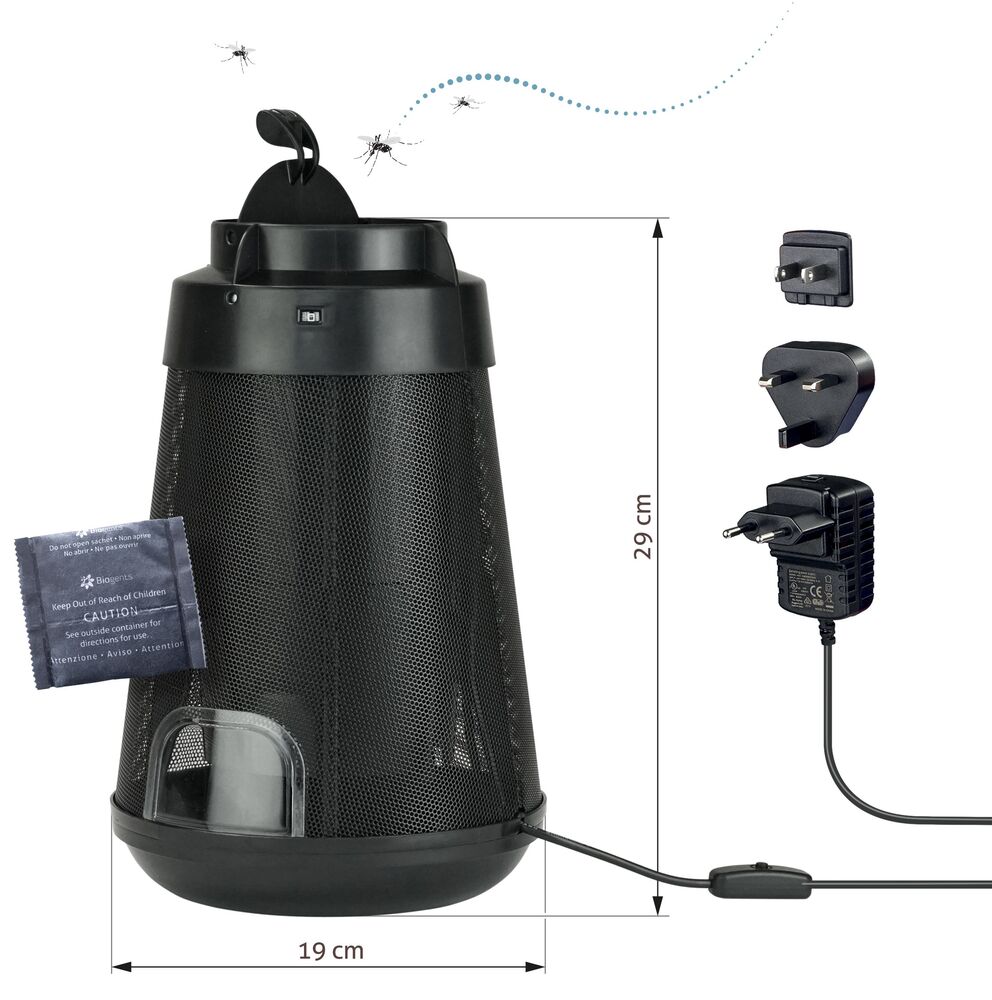 Attire les moustiques qui veulent piquer dans les environnements extérieurs. Ce piège naturel est extrêmement efficace contre le moustique tigre et le moustique de la dengue. Le piège BG-Mosquitaire attire les moustiques par la combinaison de trois facteurs : Des stimuli visuels Des stimuli physiques Une odeur attrayante (ce piège inclus une recharge sweetscent qui doit être changée tous les 2 mois) Ces facteurs, combinés au ventilateur intégré, créent des courants d’air qui imitent l’odeur humaine, attirant ainsi les moustiques vers le piège où ils se déshydratent et meurent.