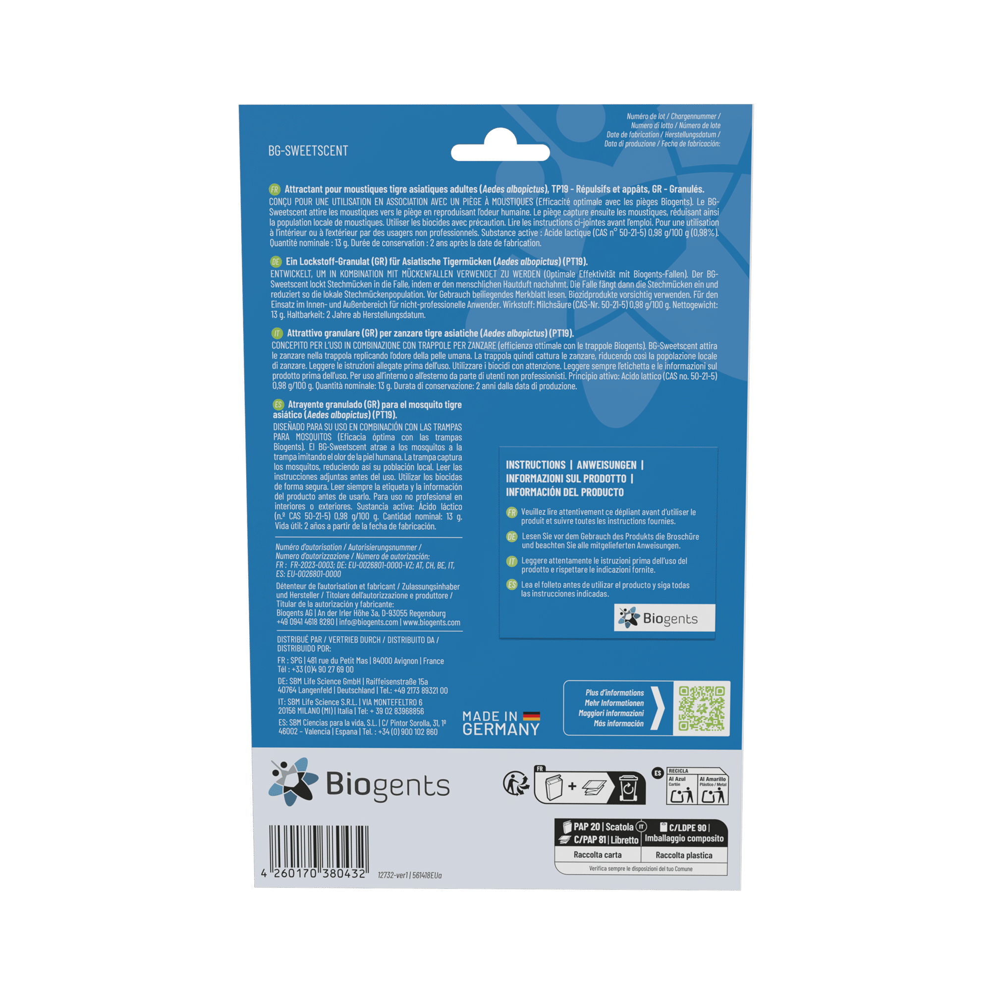 Il est recommandé d’utiliser BG-Sweetscent en combinaison avec le CO2 (BG-Mosquitaire CO2) pour augmenter la capture du moustique commun.