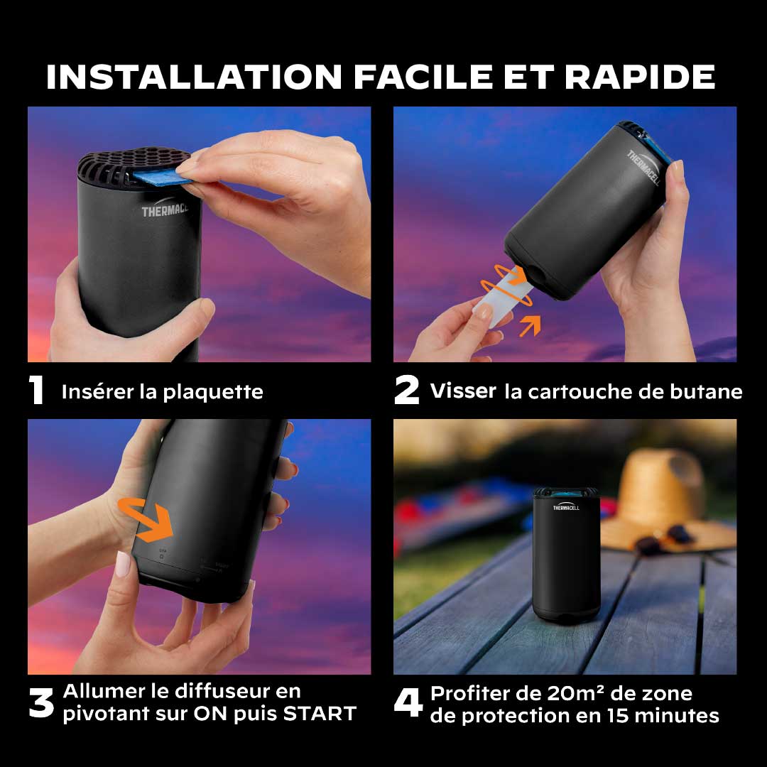 Après avoir été déçu par tant de dispositifs et même des très coûteux, celui-ci est totalement efficace, une bulle (tablée de 12 personnes ou grand salon de jardin) sans plus aucune piqûre. Bien sûr il y a les consommables mais franchement ça vaut le coup et ce n'est cher à l'heure (pour moi. durée d'une tablette et du gaz largement supérieurs aux 4 h annoncées). Mode d'emploi extrêmement simple (lire le mode d'emploi une fois pour démarrer et c'est bon !). C'est une révolution que je recommande très fortement.