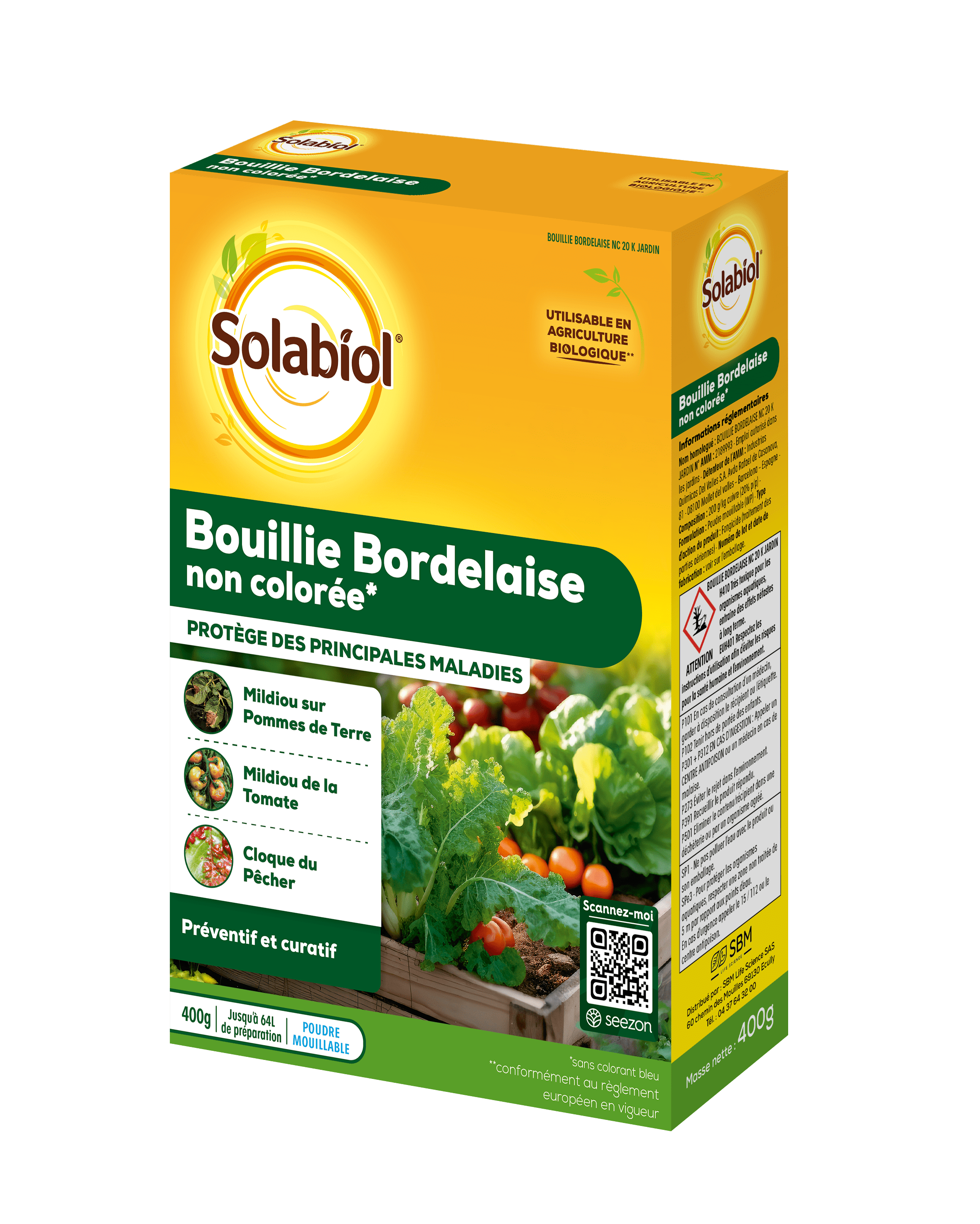 Fongicide minéral préventif à usages multiples : mildiou, cloque du pêcher, tavelure du pommier… Sans colorant bleu, la bouillie Bordelaise garde une couleur naturelle bleue/ verte pâle en raison de la couleur naturelle de son principal composant : le sulfate de cuivre.
