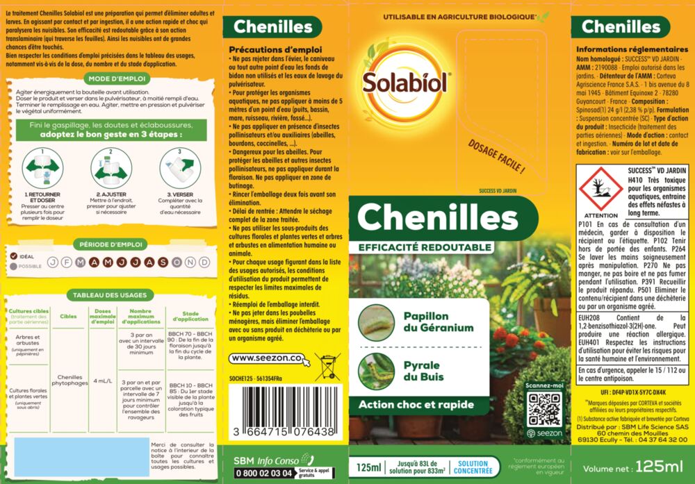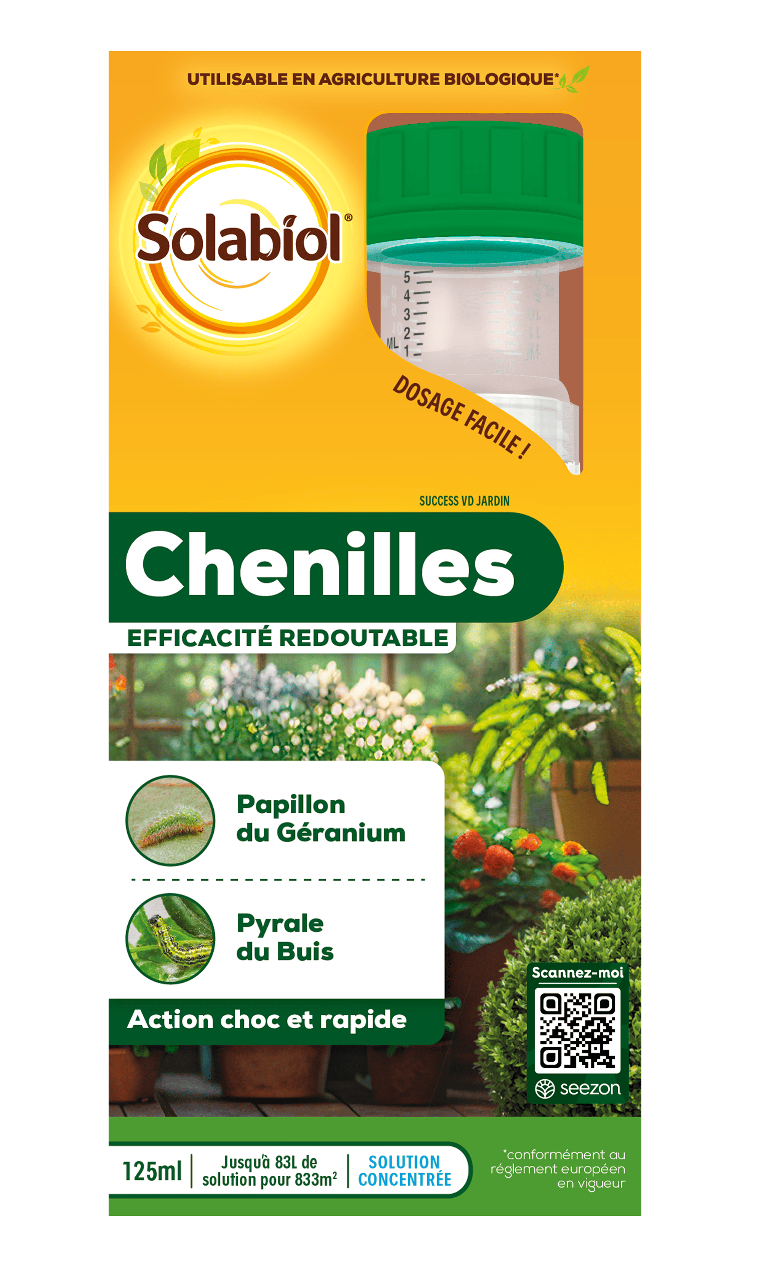 Le traitement Chenilles Solabiol est une préparation qui permet d’éliminer adultes et larves. En agissant par contact et par ingestion, il a une action rapide et choc qui paralysera les nuisibles. Son efficaicté est redoutable grâce à son action translaminaire.