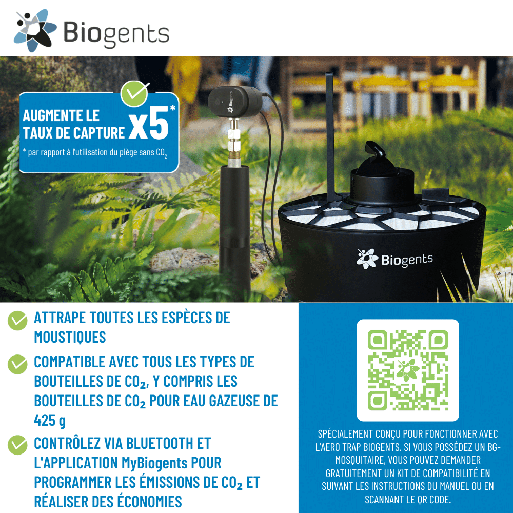 - Compatibilité: fonctionne uniquement avec les pièges à moustiques extérieurs Biogents tels que l’AERO TRAP et le BG-Mosquitaire (pour ce dernier, un kit de compatibilité est nécessaire et fourni gratuitement)