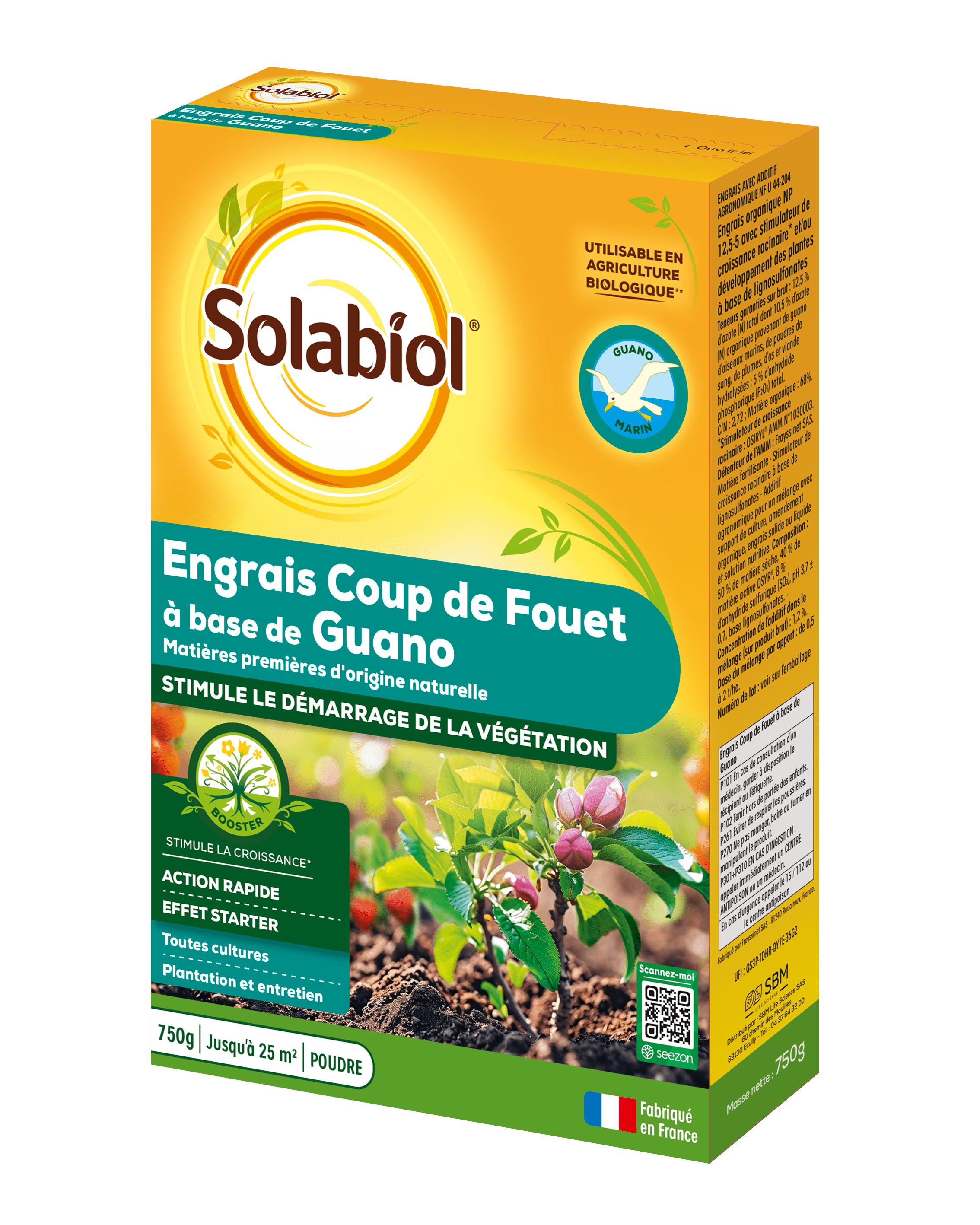 L’Engrais Coup de Fouet à base de Guano Marin Solabiol est élaboré à partir de matières premières d’origine naturelle. Il apporte tous les nutriments nécessaires et stimule le démarrage de la végétation.