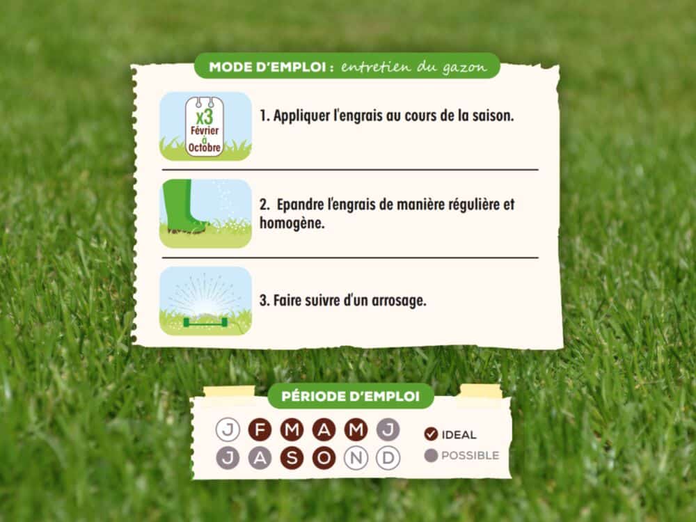 1) Appliquer pendant la saison de croissance: Utilisez l’engrais de février à octobre, lorsque le gazon est en phase de croissance active.