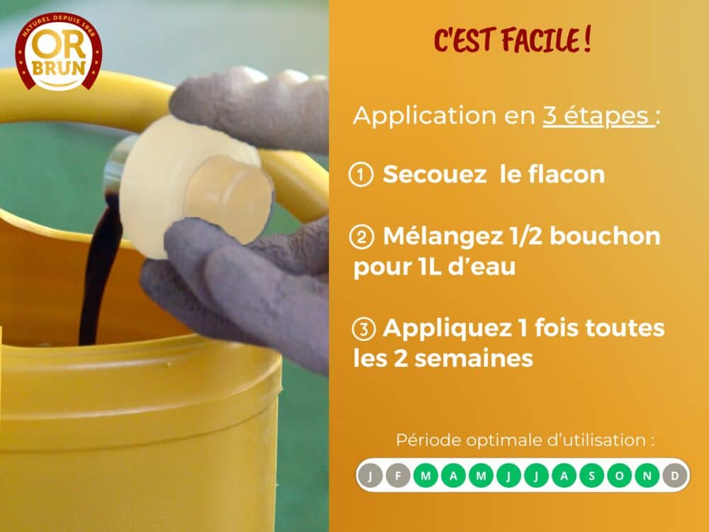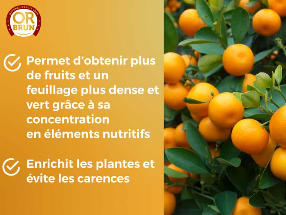 - Permet d’obtenir plus de fruits et un feuillage plus dense et vert grâce à sa concentration en éléments nutritifs