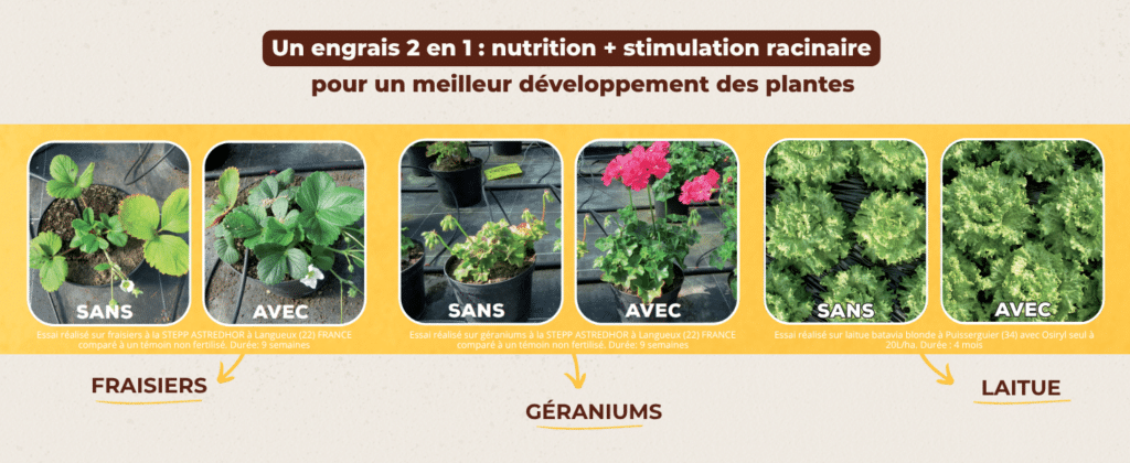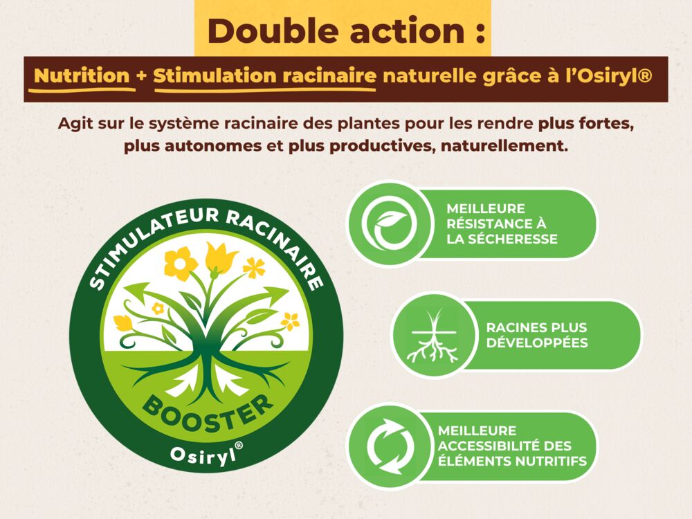 Stimulation racinaire naturelle grâce à l’Osiryl® : un biostimulant végétal d’origine naturel qui stimule les racines, améliore l’absorption de l’eau et des nutriments, et renforce la résistance de la plante.