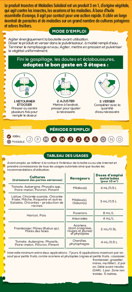 Le produit est efficace contre les insectes . Pour les maladies il faut attendre un peu pour constater un effet . L'odeur de l' orange sans considérer son effet est plutôt très agréable.