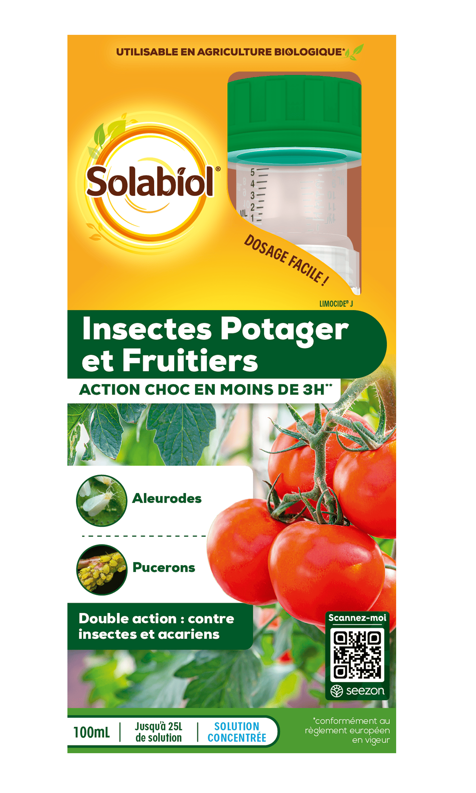 L’Insectes Potager & Fruitiers Solabiol est un produit d’origine végétale qui agit contre les insectes et les acariens. À base d’huile essentielle d’orange, il agit par contact pour une action rapide, avec des effets visibles sous 2-3h maximum. Il cible un large éventail de ravageurs sur un grand nombre de cultures potagères.