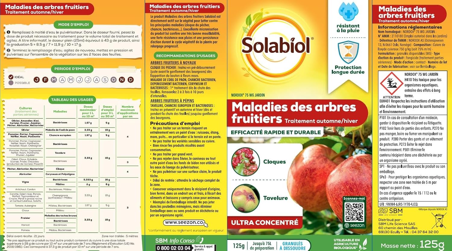 Fongicide préventif contre chancre, bactérioses, cloque et tavelure sur la plupart des arbres fruitiers.