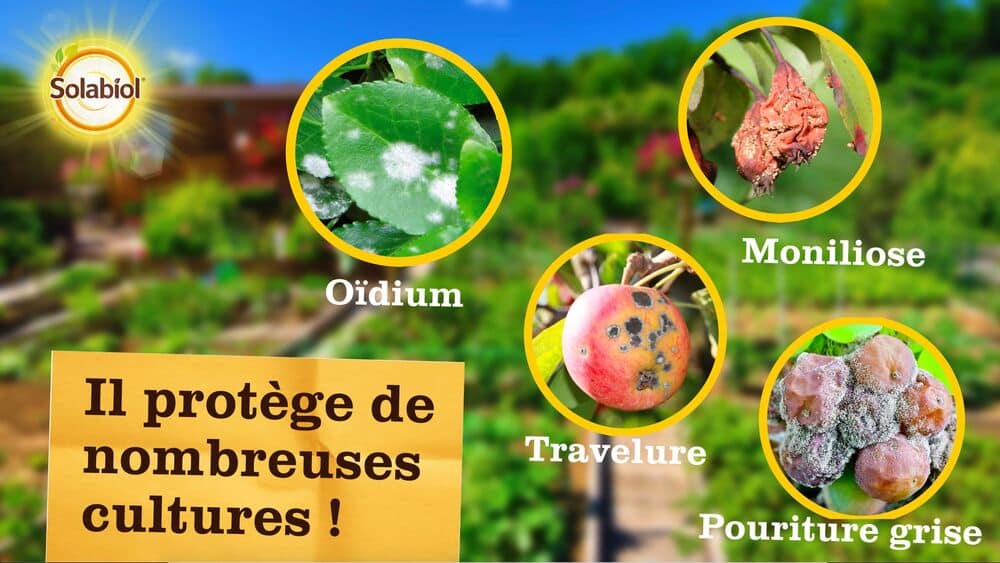 - Protège des maladies : oïdium, tavelure, moniliose, pourriture grise…