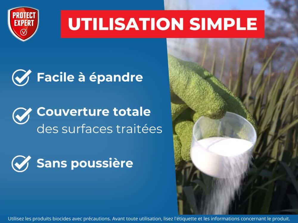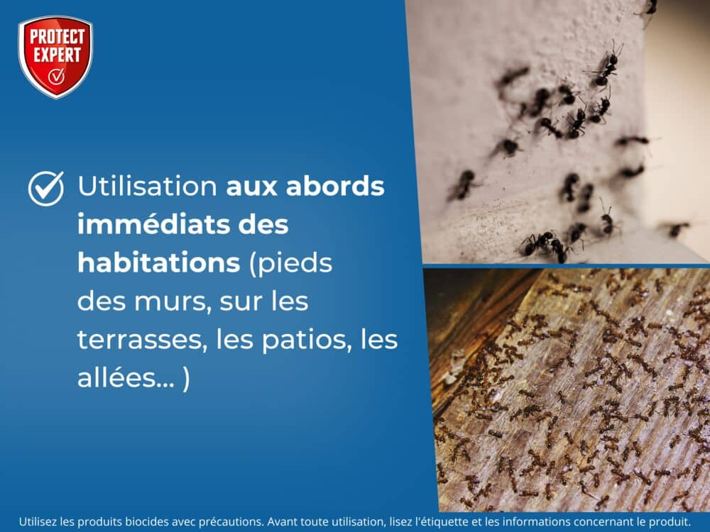 Lutte contre les fourmis aux abords immédiats des habitations et des locaux : aux pieds des murs, sur les terrasses, les patios, les allées… La poudre s’utilise contre tous types d’insectes volants et rampants, tels que : mouches, moustiques, guêpes, frelons, fourmis, cafards, punaises, acariens, puces, tiques, poux, etc.