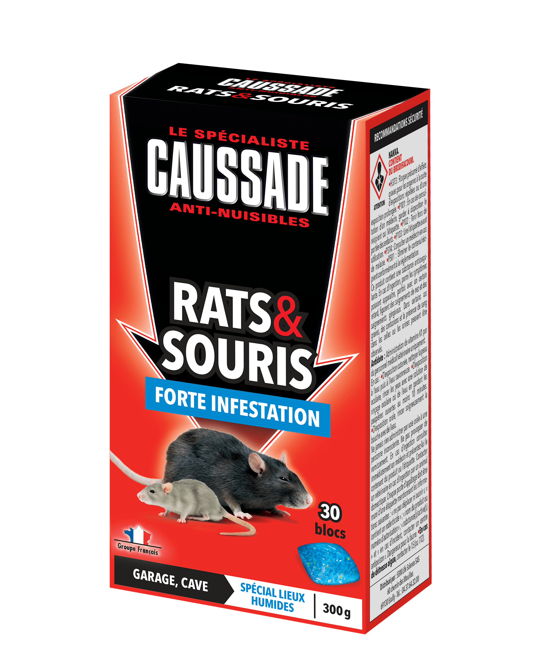 Forte infestation dans une cave, un garage, un entrepôt ou autour d'une habitation et il y a des dégâts, signes d’une forte infestation. CAUSSADE propose un bloc doté d'une grande appétence pour éliminer l'ensemble de la colonie.