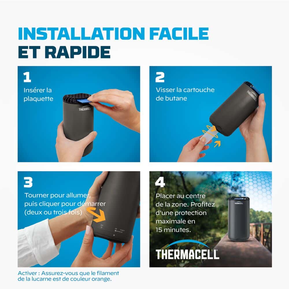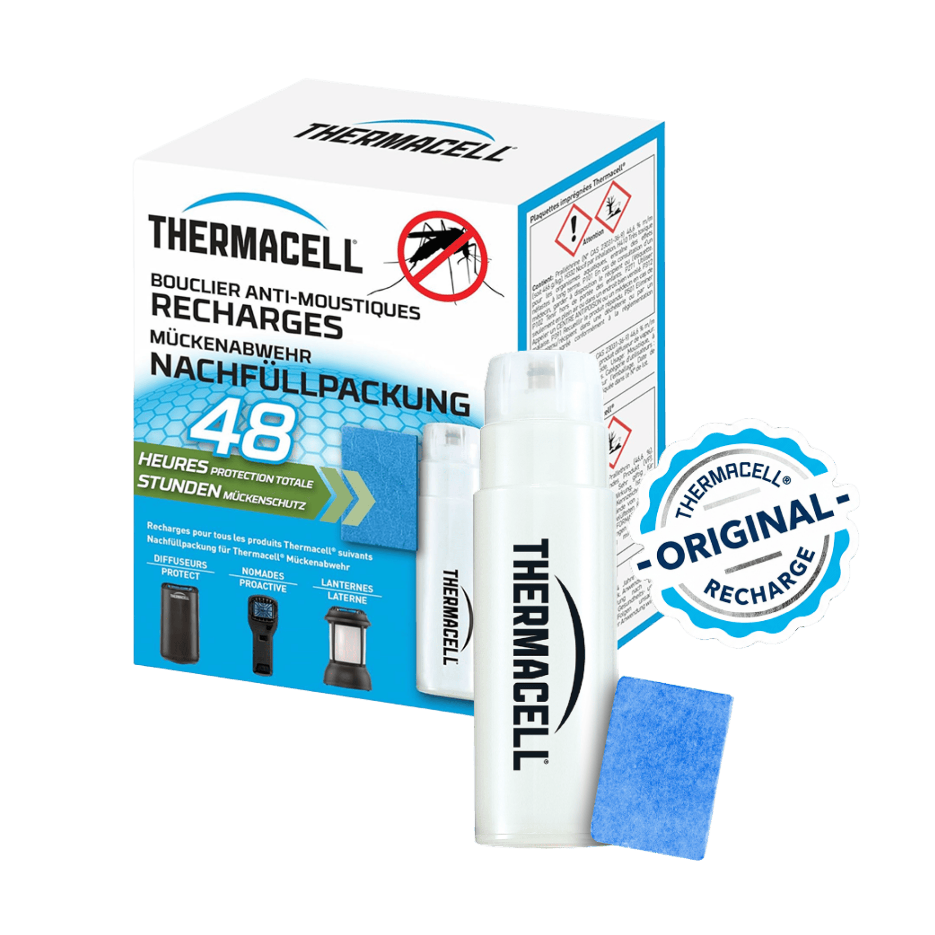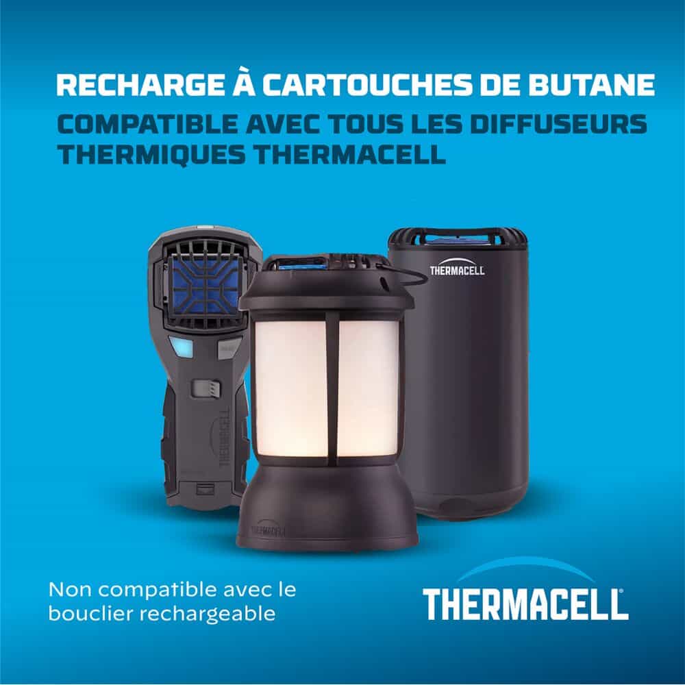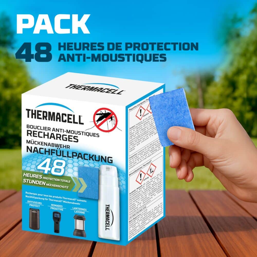 Système de diffusion anti-moustiques par plaquette, hautement efficace. La recharge Anti-Moustiques Thermacell® assure une protection totale après sa mise en route, contre les principaux types de moustiques, jusqu’à 20 m² de zone de protection. Recharges pour tous les produits Thermacell®: Lanterne, Bouclier.