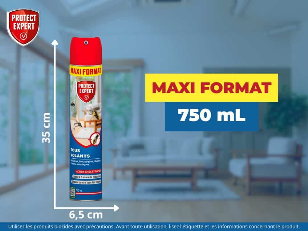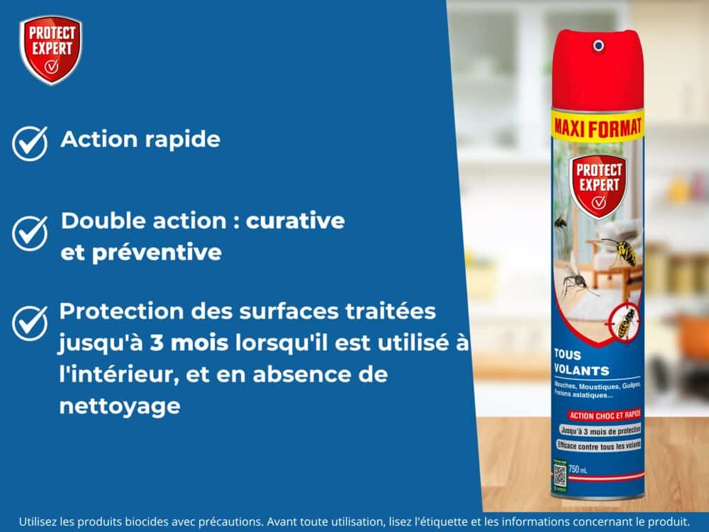 L’aérosol Tous Volants de Protect Expert élimine les insectes volants et forme une zone de protection.